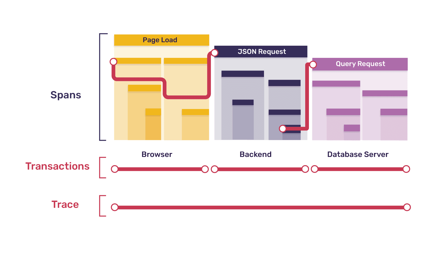 Diagram illustrating how a trace is composed of multiple transactions, and each transaction is composed of multiple spans.